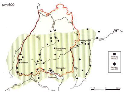 450 n.Chr.: Das Siedlungsgebiet der Alamannen erstreckt sich nun von der Iller im Osten bis zum Oberrhein im Westen, im Norden vom Main bis zum Süden am Hochrhein. Hier kommen sie nun mit den Franken - einem weiteren germanischen Stammesverband, in Berührung.